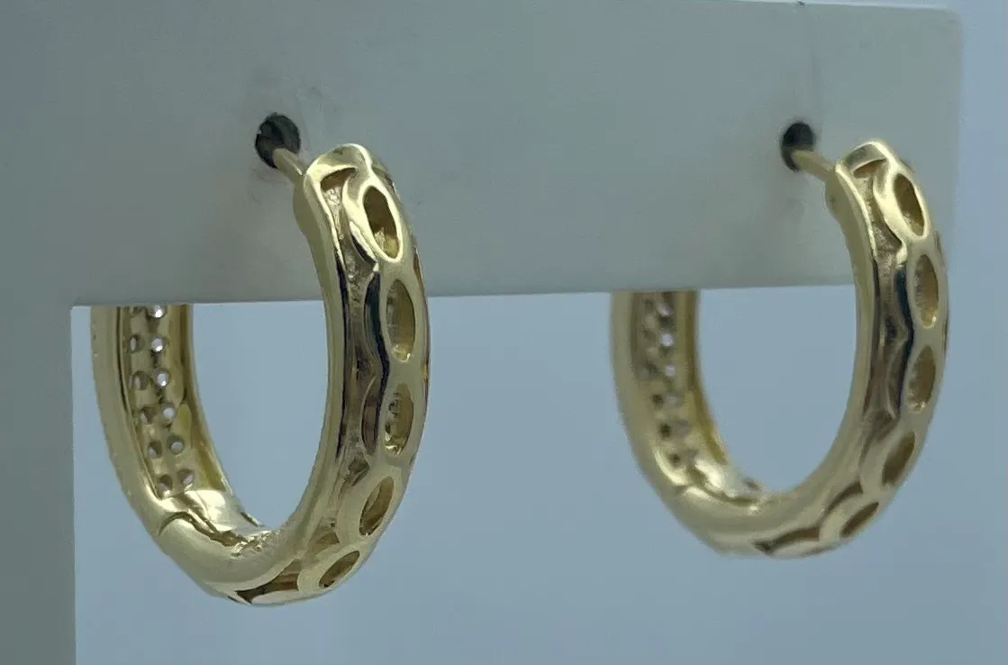 Eleve o seu estilo com nossos brincos de argola cravejados em ouro folheado. Com um design clássico e sofisticado, esses brincos são o complemento perfeito para qualquer visual. Cada argola tem 2 cm de diâmetro e 0,5 cm de largura, o que lhes confere uma presença marcante sem serem muito pesados.