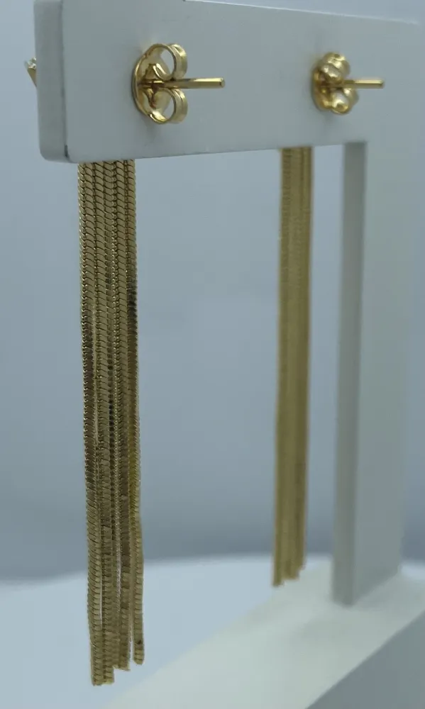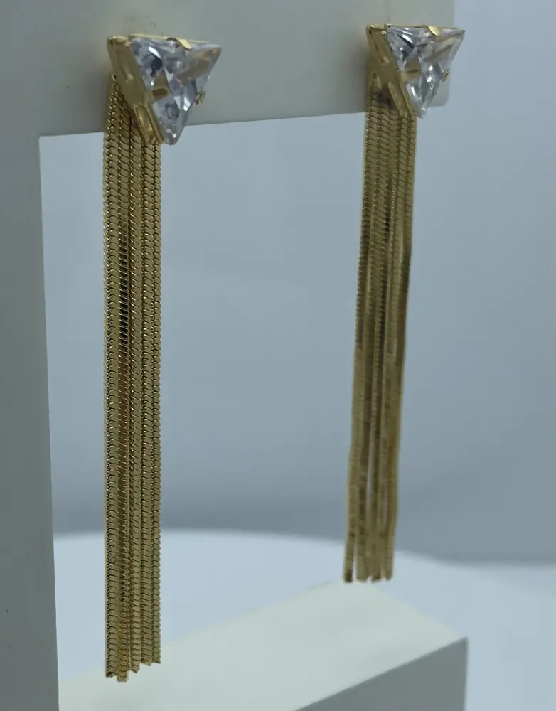 Cada par de brincos apresenta uma pedra triangular deslumbrante que captura a luz de maneira cativante. Abaixo da pedra, as franjas adicionam um toque de movimento e dinamismo à joia. Feitos com um acabamento em ouro folheado de alta qualidade, esses brincos são duráveis e resistentes, mantendo sua beleza por muito tempo.