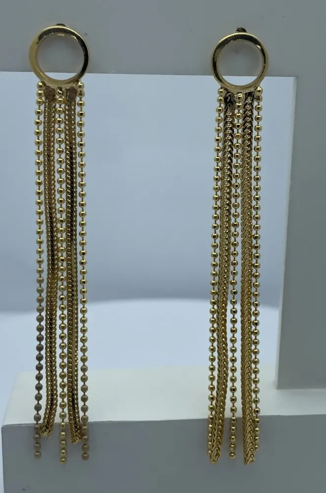 Deixe-se levar pelo movimento e pelo estilo com nossos brincos de franja deslumbrantes, que têm um tamanho total de 6,5 cm. Com franjas delicadas que dançam ao redor do seu rosto, esses brincos adicionam um toque de elegância e sofisticação ao seu visual.