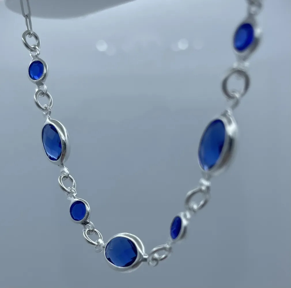Celebre a elegância tranquila com a nossa pulseira de prata e pedras azuis. Adquira a sua hoje e permita que esta joia seja a expressão encantadora do seu estilo, adicionando um toque de serenidade e brilho a cada momento.